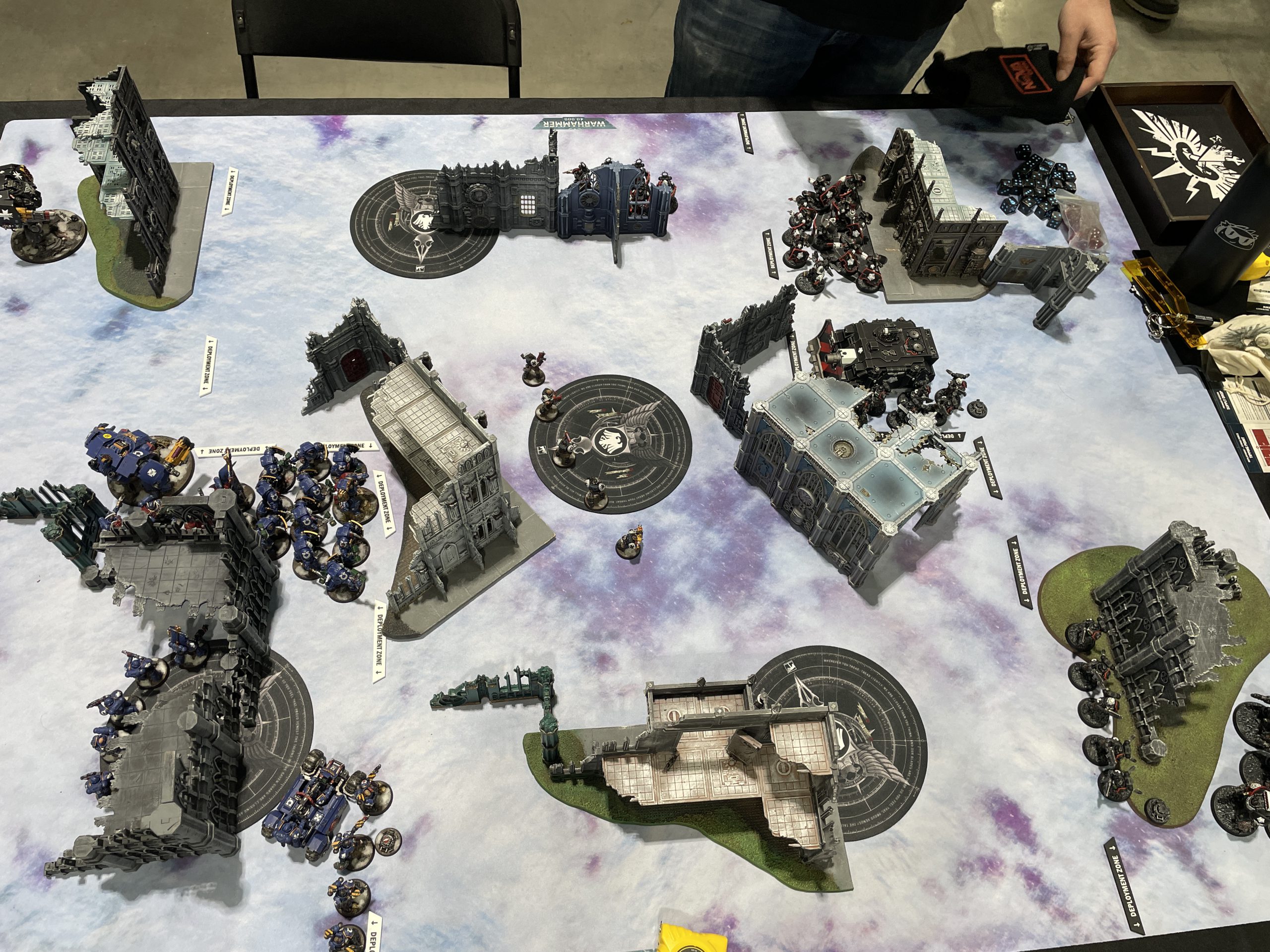 Ultramarines vs. Raven Guard at Adepticon 2026. Credit: SRM and Dan BoydDan and I maybe get to play each other once per edition, so we made a point of getting each other on the books for our first game. Both lists were reasonably tuned for competitive play, and we set up an approximation of a competitive layout using the Flex terrain. As this event largely inherited the old Adepticon 40k terrain, it's more suited to casual or narrative play than strict symmetry. Regardless, we soldiered on. I had first turn, a bad hand for objectives, and took it cagey as a result. He similarly was holding his forces back in turn 1, as we only had some light skirmishes over the objectives in no man's land. Said skirmish also accidentally zoned out my Hellblasters, who I really wanted to pop his 6-strong Devastator Centurion squad. However, that's where my Inceptors delivered. I dropped both squads next to his Centurions, and he popped Armour of Contempt, absolutely stonewalling the first squad. The second squad, however, lit those power-armored chubsters right up, almost clearing the squad in one gnarly fusilade of bolter fire. My Victrix tore into his Vanguard Veterans, while my Assault Terminators promptly failed their charge on his Vindicator and plopped in the middle of the board, where they would proceed to stand around getting shot until the game ended. Taking out those Centurions seriously defanged the ability for his army to do much damage, and the rest of the game was scrappy little hit and run attacks from his smaller squads into my larger ones, never quite doing enough damage to take my squads out. It was a low scoring game, but I shut him out on primary. The Ultramarines ended up taking the day, and we had a great time duking it out together. Our game took a bit longer than I think either of us expected due to the number of friends and listeners coming up and saying hello, but I certainly won't lament getting to spend longer at the table with one of my best friends.