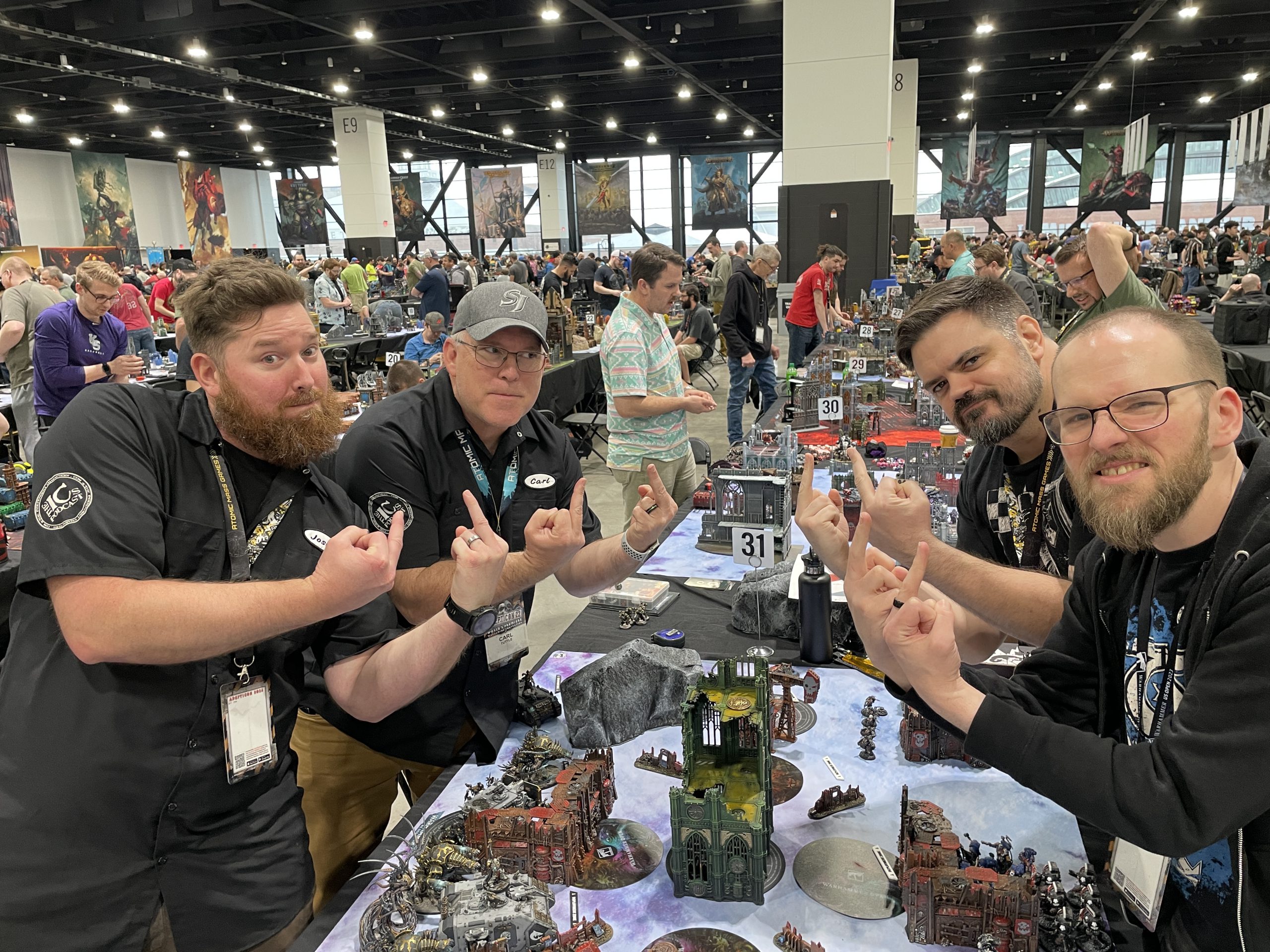 The Independent Characters vs. The Badcast Bois at Adepticon 2026.I always try and get a game in with Carl at Adepticon, and I've only played a single game of Necromunda wish Josh, so I pitched the idea of doing a doubles game of our two podcasts against each other - The 40k Badcast vs. The Independent Characters. For those who don't listen, Dan and I have transformed from narrative gamers to Genuine Competitive Perverts over the last four years or so, and the Independent Characters have largely stuck to their garagehammer roots, so a strictly competitive Matched Play game probably wouldn't be the most fun for anybody. We'd each take 1000 point lists, and as I declared the challenge, I'd let them choose the turf. They picked a White Dwarf Bunker mission, where the table would have nine objectives, with half toggling on or off in each turn. What unfolded was a total blast of a game, where the ICs crew took an early lead on objectives while we hid from Carl's Forgefiends and Josh's Land Raider Redeemer, waiting for those threats to get taken down before committing with our more fragile infantry. Unlike last game, this time the 10-strong Terminator and Calgar brick actually did some work, taking the charge from Josh's oversized Assault Intercessor squad, clearing them out, and only eventually falling after successive fights with Vashtorr and a Maulerfiend. Cato Sicarius and his Victrix avenged the Chapter Master, with Sicarius alone one-rounding Vashtorr with Devastating Wounds. We'd largely cleared the table of Josh's assets by turn 3, and were able to just squeak by on score by the end to get the win. It was one of the most fun and chaotic games of Warhammer I've played in years, and it was great to meet the ICs where they're at and hang out with our Ham Dads for a couple hours.