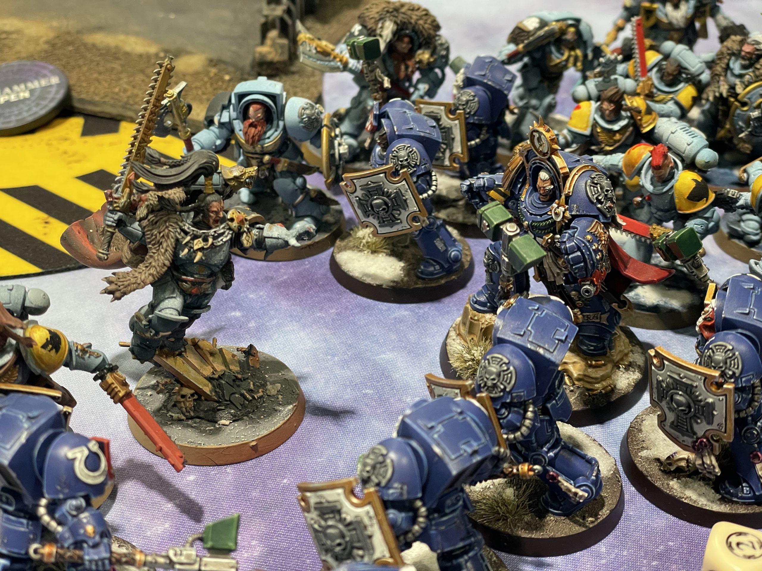 Ultramarines vs. Space Wolves at Adepticon 2026. Credit: SRM and IanI've been seeing Ian at cons since, geez, maybe Adepticon 2017? 2019? A long time either way, and in all those years I don't believe we've ever actually gotten a game in. He's been playing loads of 40k with his Space Wolves over the last year, assumedly in one long Rocky-esque training montage, and he booked a game with me via the Badcast spreadsheet mentioned approximately thirty five years ago in this article. Leaning into the spirit of the event, I said we should go for a White Dwarf mission, and it ended up being one where we each picked priority targets to take out in our opponent's armies, plus some extra points for objectives and the like. We each picked a hammer unit (my Terminators and Calgar, his Blood Claws and Ragnar Blackmane) and a chaff unit (Scouts all around) to keep things fair, and got to slamming. On turn 1 my Incursors Scouted up and cleared his Scouts, while my own Scouts hid away, playing keep-away with their piñata of victory points. As per usual, my Terminators slammed into the middle of the table, staging in a big ruin before crashing out and clearing Ragnar's boys, nabbing me some more victory points. It took a second squad of Blood Claws, several Terminators, some absolutely flubbed Desperate Escape test rolls, and a smidge of shooting, but Ian eventually took down Calgar and his running crew, earning some victory points after a several turns-long melee in the middle. My defensive stratagems largely frustrated Ian's efforts against my Victrix and Redemptor (Venerable Brother Thiccums) leading to the fall of Arjac Rockfist and his own Terminator crew, and the ensured survival of my fragile and valuable Scouts. By the bottom of three Ian was basically out of assets with no way of getting to said Scouts, and with a firm lead on points, we called the game there, another victory for the Ultramarines. It was great to finally play Ian after all these years, and he was a joy to hang out with. I scarfed another acai bowl for lunch and got to my next game.