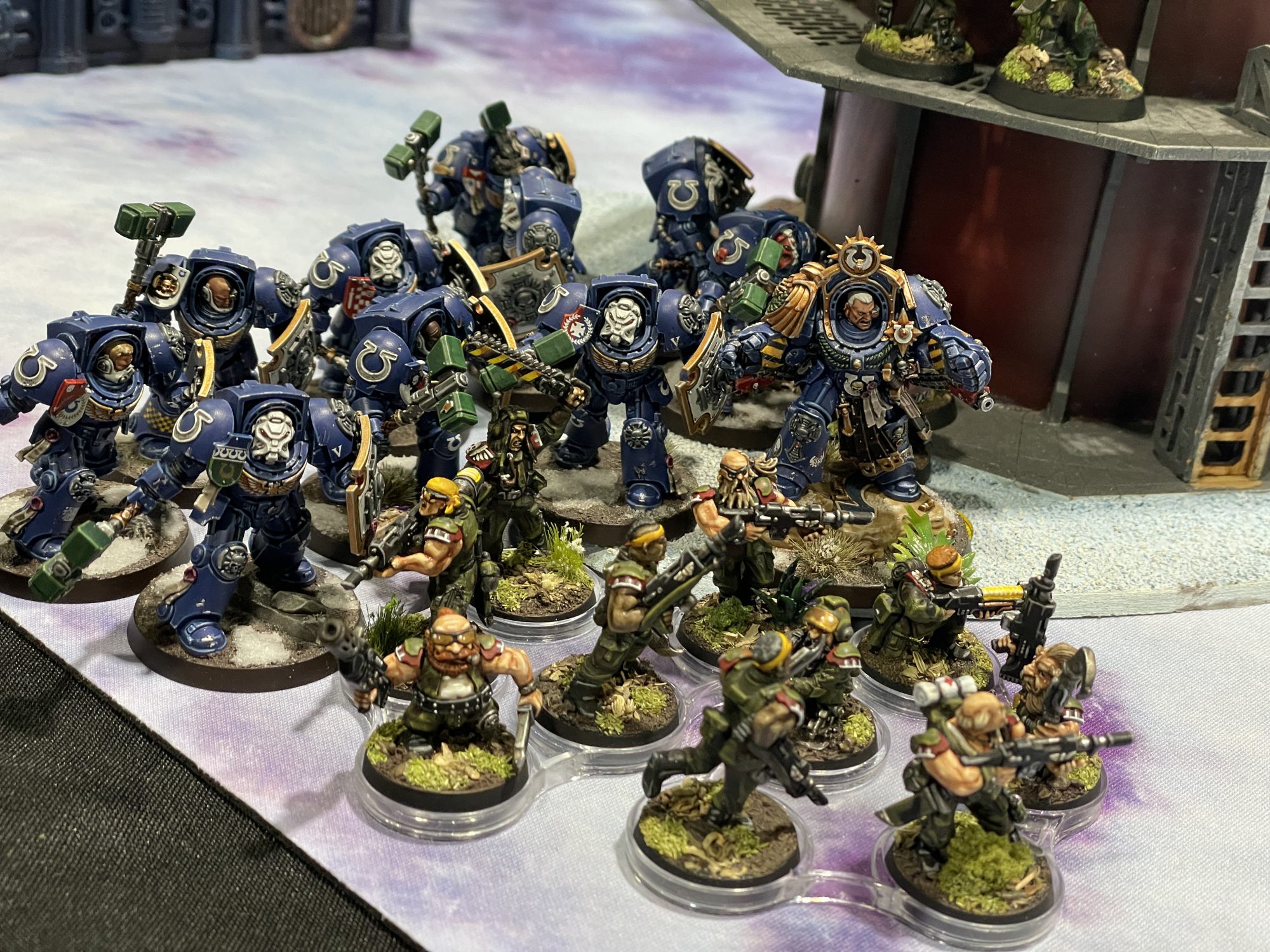 Ultramarines vs. Catachans at Adepticon 2026. Credit: SRM and Peter DolanPeter is one of my dearest friends in this hobby, with our first games going back to games at my apartment over a decade ago, and combo party/Warhammer weekenders at his old cabin in New Jersey, where I would meet the people who would eventually be running the show at this very website. We've had couples camping trips, wargaming weekends, parties and hangouts aplenty over the following years, and I was so happy to hang out with him and Kat at Adepticon this year. I picked a mission that seemed fun for us from the White Dwarf stack, again trying to lean into the spirit of the event despite my competitive proclivities. This mission, however, was kind of bupkis. Half of each player's army goes in reserves, and unless you hold the central objective, you can only bring one unit in at a time, with all of your reserves showing up at the end of your third turn. In theory, this means each player has a drip feed of units coming in, simulating a meeting engagement. In practice, this means the player holding the central objective will smash their opponent with far more assets on the board, while that second player will have only two turns to make up the difference. Reader, I was that first player. I infiltrated some Scouts on the central tower, Scouted my Incursors towards the second before taking it in turn 1, and was able to hurl my Victrix Guard into Peter's defensive line of Catachans at the top of turn 2. By the time Peter's Rogal Dorn arrived, he was already hemmed in to his deployment zone, and while it cleared most of my Victrix Guard out, the block of Terminators was right behind them. Inceptors dropped in and took out his Kasrkin and Ursula Creed before hopping over to his home objective, my chaff units held onto those central objectives, and the drip feed of Guard units just wasn't enough to deal with a 46 wound brick of 4+ Invulnerable Save models in his backfield. Eventually Rough Riders, Sentinels, and Kasrkin came in to save the day, grabbing my home objective and taking one objective from the Incursors, but it was too little, too late, in a mission that set us up for a sadly foregone conclusion right off the bat. It was still a delight to hang out with Peter, and it was a great looking game even if it was far too one sided. I very much appreciated the iced Americano Kat picked me up from Stone Creek Coffee; mild and not too watery in the way an iced Americano can be. My brain was cloudy as hell after four days of beer and cheese and five days of bad sleep.