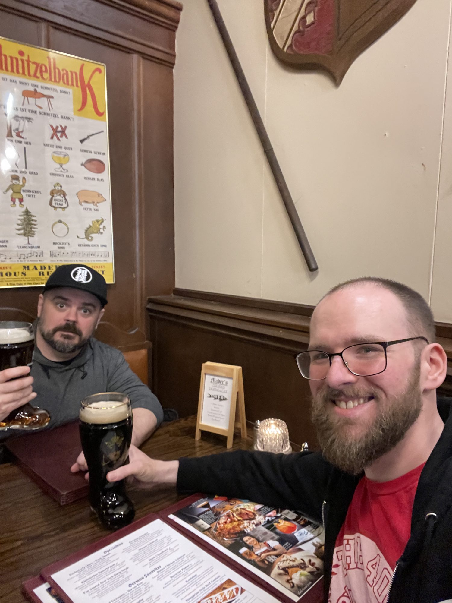 Dan (left) and Campbell (right) with their too big beers. Credit: SRMI caught up with Dan once he finished his game with Craig "MasterSlowPoke" Sniffen and his beautiful Rainbow Warriors, then Dan and I headed to Mader's, a German restaurant and local institution with a celebrity guest list of both the coolest and most canceled famous people you can imagine. On the one hand, you've got a handwritten note from John Wayne complaining about the lack of legroom under the tables. On the other, Billy Gibbons and the guy who designed the 60's Batmobile ate here too. Walking past stained glass and suits of armor to sit under a heraldic shield and several crossbows, zweihanders, and other medieval accoutrements, we each got a comically large boot of beer. I got a Köstritzer Schwarzbier, the ideal form of that vaunted German style. Is a literal liter of beer too much? Absolutely, I don't recommend it, as you'll have to drink it pretty fast if you don't want it to get warm. It was a good enough beer that drinking it that quickly wasn't much of an ask, however. It paired with their Rehinischer Sauerbraten, roast beef with gingersnap sauce over gluten free spaetzle and pickled red cabbage. It was warming, with the sauce and golden raisins offering an unexpected but pleasant sweetness amongst the slabs of savory beef. Tragically, I couldn't finish the whole thing, even as I shut up and chewed while Dan explained the movie Beerfest to me. I shot back, recommending the Naked Gun requel, which has a joke density that is pretty unmatched in modern comedy. It was a great hang, and one of the quieter ones among all the clang and clamor of Adepticon.