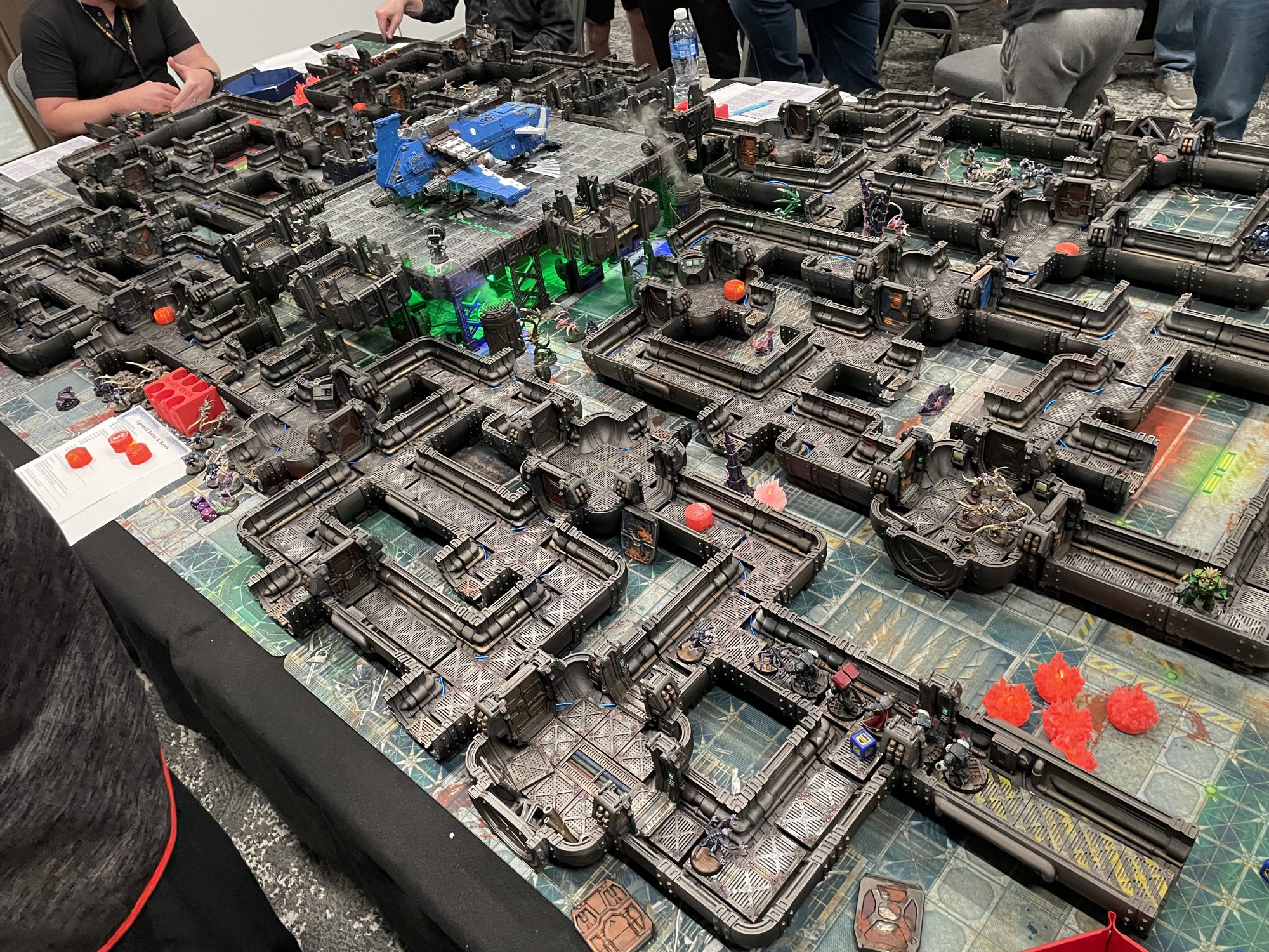 Basement of Death Space Hulk at Adepticon 2026. Credit: SRMThe Basement of Death crew have been running awesome Space Hulk games for years now, and they've got the scenario down to a science. Six players each take a team of Terminators, and the BoD crew, now joined by Carl and Chelle, run the Genestealers. This is a board game expanded into convention-level spectacle, blown up into the third dimension with modeled corridors, with LED lighting and smoke machines for ambiance. I played last year, and was lucky enough to bring Dan along for the ride this time. Unfortunately, in this take on what is essentially Aliens: The Movie: The Game, while someone gets to be Hudson, someone has to be Hicks. Dan immediately lost his Chaplain, and my Sergeant wasn't far behind. Josh and Aaron were absolutely killing it with their Space Wolf and Salamanders teams, while Skye's Imperial Fists clambered forward. Dan's Ultramarines continued to be picked off one by one, and while the Inquisitor leading my Black Templars did reasonably well for a time, once he went down the rest of my guys weren't long for this world either. I managed to run one trooper far enough to mash the button and give my fellow Marine players an extra turn to extract from the ship before it exploded, but sadly Dan and I spent a good portion of the evening just waiting to die after some early bad luck. So it goes with Space Hulk. Last year I definitely had a better time, but I won't chalk any of that up to the people we were playing with, as they're all great folks and I'd happily play again. Sometimes that's just how dice games go.