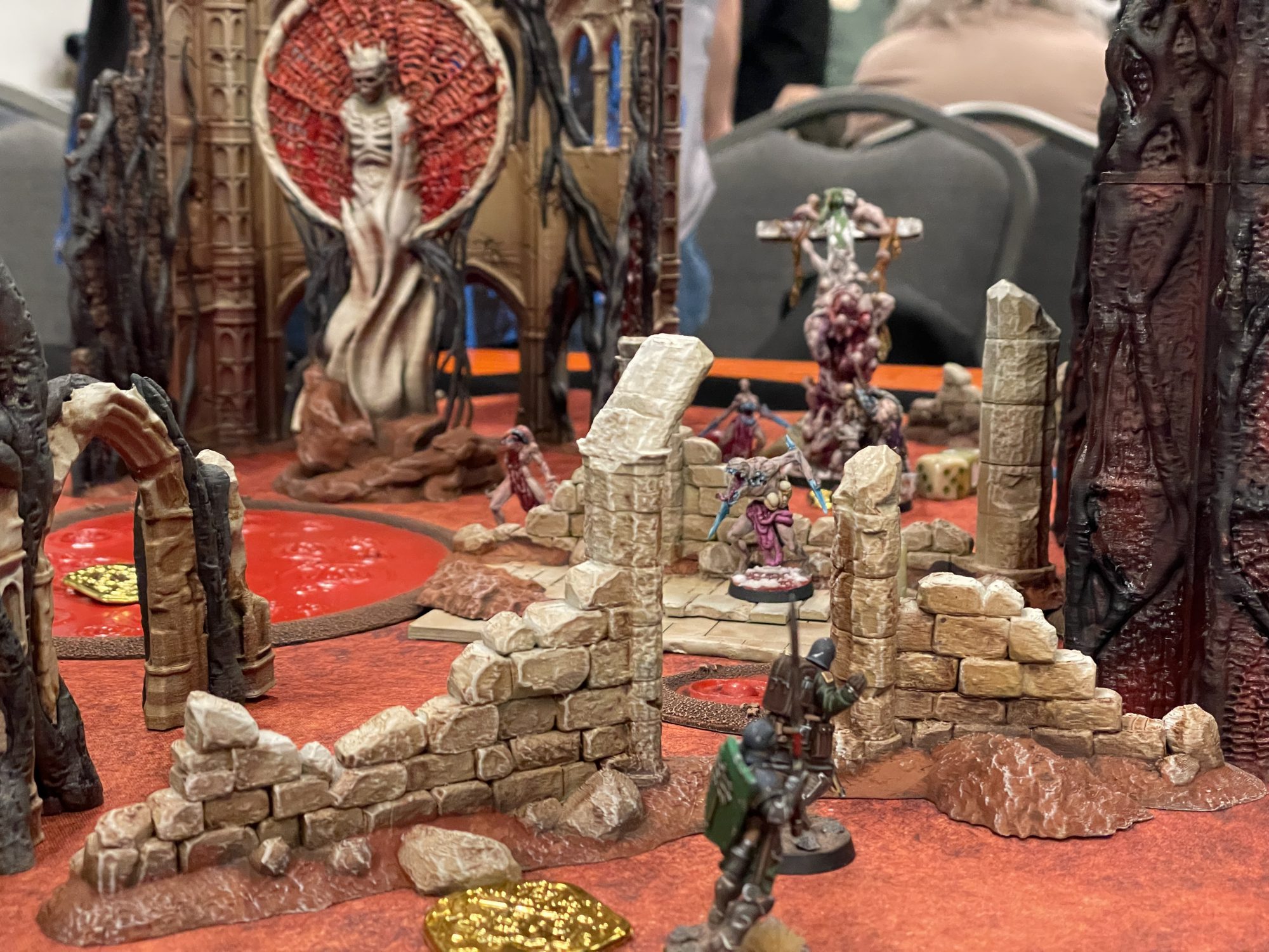 I woke up well rested and excited to Crusade some Trench, though the four game schedule of the day did have me a smidge worried. I steeled myself with a hot black coffee and another yogurt from the hotel Starbucks, then made my way to the Trench Crusade narrative.If upstairs in the con was the glitzy, polished, and approachable side of tabletop wargaming, the area where Trench Crusade, Mordheim and other skirmish games lived like was the back alley basement bar where everyone cooler than you hangs out. Seemingly every queer punk in the entire con was down there, and the vibes were excellent. I hung out with Alice (in a nun's habit, leaning into her Papal States force) and Norman (in a Goonhammer jersey, not thematic, just repping the brand) while we waited for the first round to start. Norman agreed to match into me first round so I could get to grips with the game again, which might have been a bad move since the guy who ran the Trench Crusade GT the day before should be more than capable of kicking my poor New Antioch warband's collective asses. As pairings were firmly vibes based (we were meant to just walk up to people or sit at tables and ask them to play) this pairing didn't upset any delicate BCP balance.