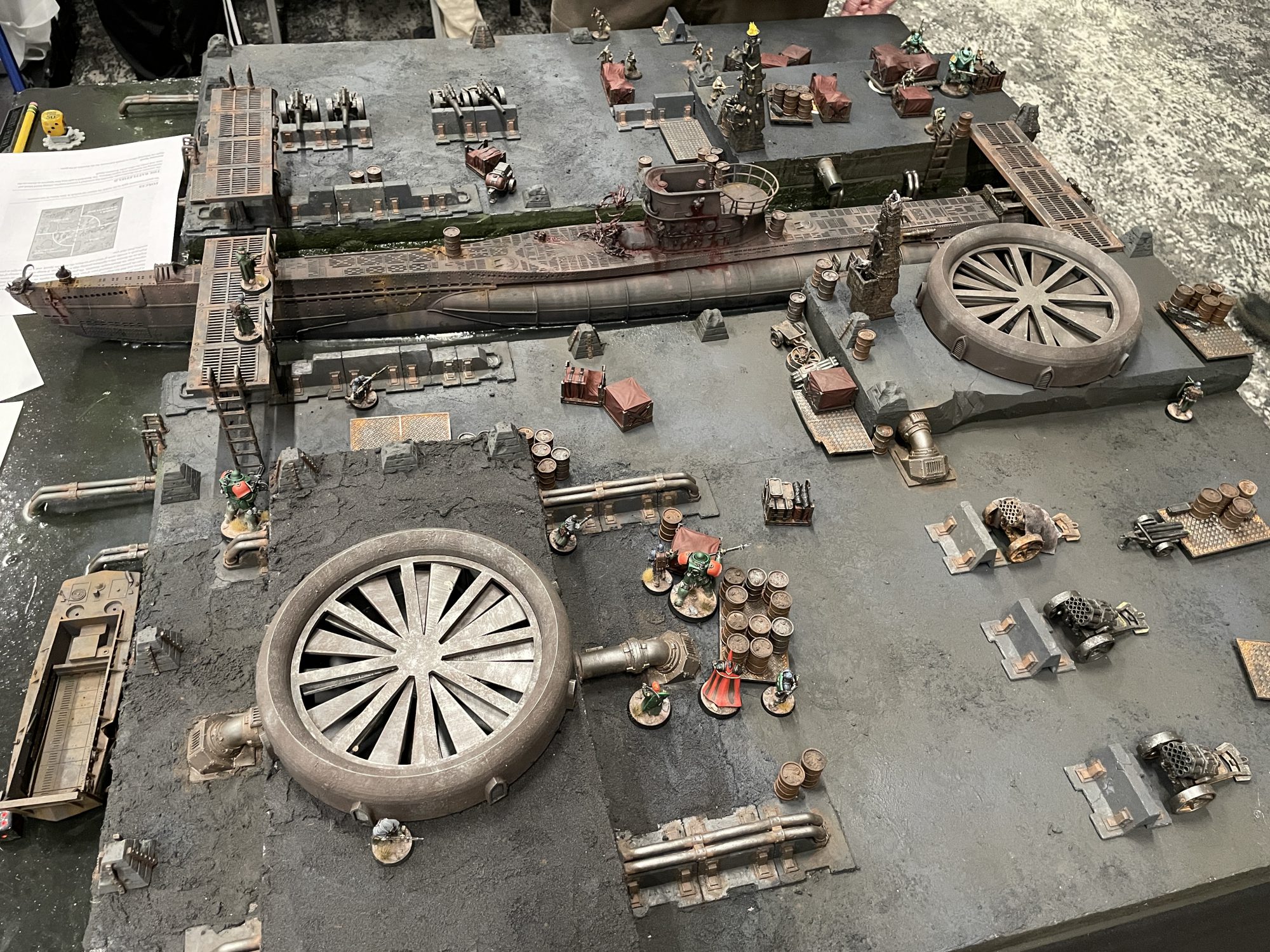 New Antioch vs. New Antioch at Adepticon 2026. Credit: SRM and GeoffWe were both looking for tables and didn't end up finding any Heretic forces to fight, so it was a New Antioch vs. New Antioch mirror match. People of the same faith never fight over minor differences, right? Certainly two sects of Christianity wouldn't murder each other for reasons inscrutable to someone outside of their specific denominations, right? What a wacky fantasy game this is! This battle took us into a submarine dock, where the table would be bathed in darkness, save for one quarter which would be illuminated each round. Points were scored by holding territory, with extra points for holding the illuminated quarter. The first few turns were slow, each of us racking up equivalent points as we couldn't do much damage to the other guy - long range debuffs were significant given the darkness of the map. However, Sniper Priests gonna Sniper Priest, and ours were still putting some hurt out. The real battle emerged over a narrow bridge on the east side of the map, where my Trench Mole Yeoman (Molière, RIP) held up his advance, only for my Combat Engineer to return and huck a Satchel Charge, wiping out Goeff's advance and clearing the path for my Lieutenant to rush in. By the time I finally broke through, however, the game had run its course, and Geoff had racked up a few more points than I did. It was a hell of a game though, and we both had a great time with it. That Satchel Charge, in all its self-destructive glory, was probably my favorite moment of the day, and that board was just incredible. Hell, all the terrain in this event was some of the most beautiful and thematic I've ever played on, but the submarine boards were especially cool.