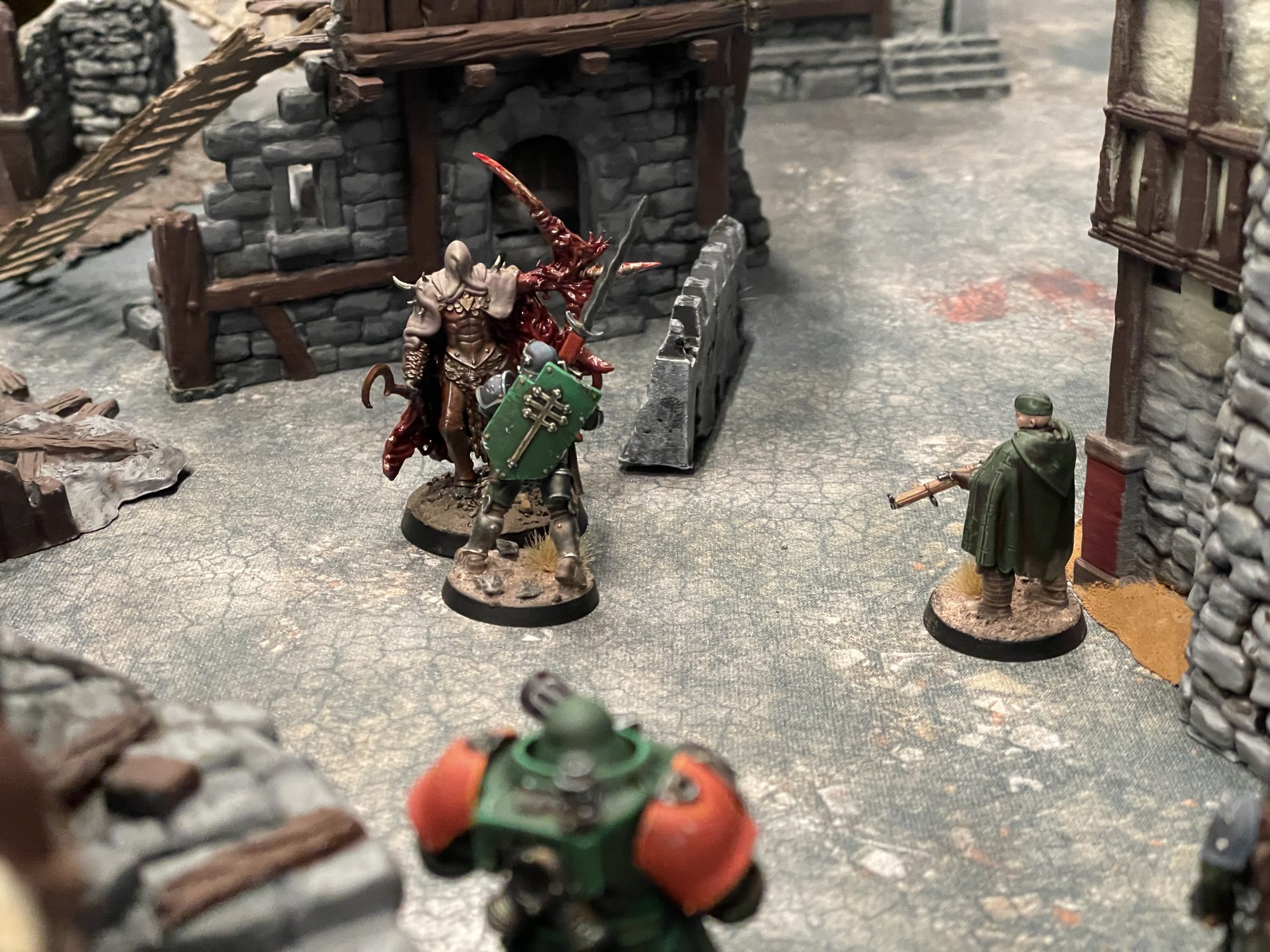 New Antioch vs. Court of the Seven Headed Serpent at Adepticon 2026. Credit: SRM and AustinI'd met Austin at one Adepticon or another several years past, as he was part of the old Independent Characters crew. I don't believe we'd ever actually gotten to play though, and when we met the day before, we promised to rectify that. We set up our game on what was definitely a Mordheim board, replete with Skaven graffiti, and played a scenario similarly right out of Mordheim, competing to gather