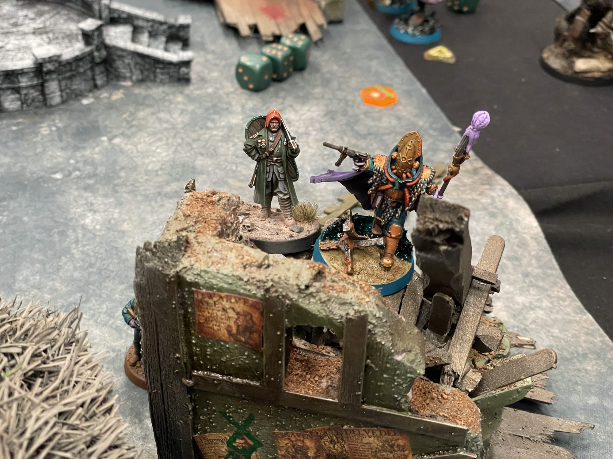 New Antioch vs. Naval Raiders at Adepticon 2026. Credit: SRMThis scenario was wild, and as a result I think everyone got to feel a little bit bad for a while. It's the Hunt the Dragon scenario, where an extremely dangerous monster in the middle of the table will move towards the closest model and attack it, unless something else draws its ire. For the first full turn, I couldn't beat a 5 on 2d6, and I was starting to get a bit frustrated, all while my opponent was dropping my dudes left right and center. His first attack from his Artillery Witch took out my one useful Heavy Mechanized Infantry dude, while a shot from downtown knocked my Sniper Priest off his belltower, though Padraic miraculously survived. Meanwhile I'd fail my aim action and end my turn early. Then, as if on cue, he started rolling 6s to activate the monster, and as most of his dudes had advanced up the board already, it started swiping at his warband and wiping the floor with them. Around this time my troops decided to renounce God and start praying to the giant grody hand floating around the middle of the board, as it was activating fairly often and slamming Heretics pretty reliably. The east flank was mostly my dudes getting shot and the floating hand clapping the Heretics for me, while the west flank had more of a fight going on. He tried to move my Mechanized Infantry towards the hand with Puppet Master, but I skirted the flanks of the table and finally got to grips with him as my dice heated up. A back-and-forth battle between his Heretic Priest and my Lieutenant ensued, involving a lot of running away, shooting, then charging back in, at least until my Combat Engineer did what he does best and blew the Chorister and Priest up with a Satchel Charge. Our surviving troops ran to the corners as we avoided the hand's ire, and by the time it turned towards my side, including the heroic Yeoman Shaughnessy who survived two entire rounds of combat against it, my opponent was mostly out of models and I'd managed to score a tiebreaking Epic Deed by taking out his leader. When the dust settled I don't think either of us were too thrilled with that particular battle, as luck made it particularly swingy and neither of us wanted to commit to fighting the hand, but I know on other boards people were able to one-round it with sufficiently hot dice. With dice like mine that round though, I doubt it would have gone so smoothly. I also might have gotten a contact high because my opponent was vaping the whole time, which, hey, please don't do that.