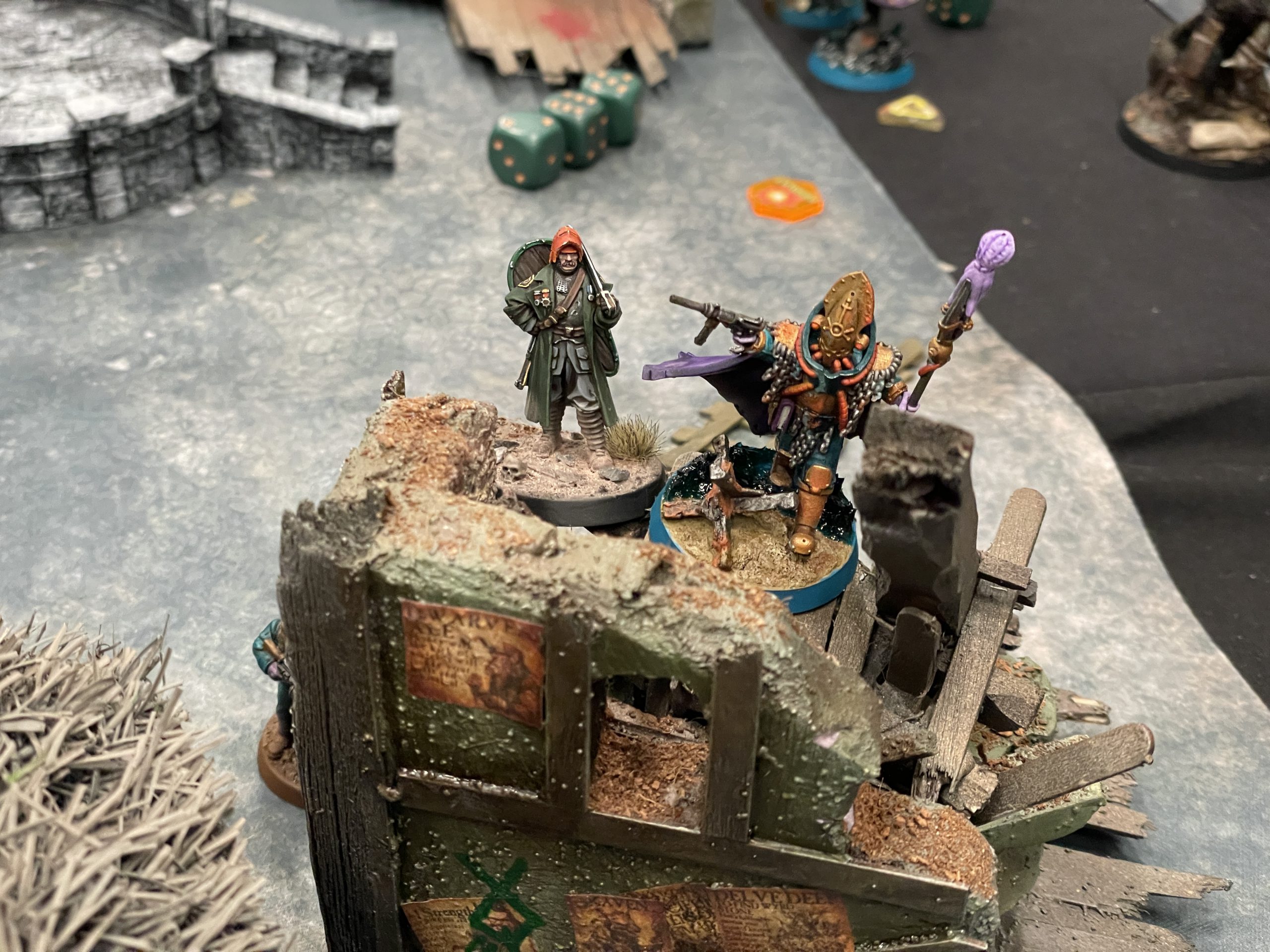 New Antioch vs. Great Hunger. Credit: SRM and NormanI hadn't played into this particular warband yet, and found them to be extremely difficult for my poor dudes with bolt action rifles to really do much about. Norman knew what he was doing with them, including avoiding the pools of boiling blood that dotted the field. As I had no flame weapons, I lacked the specific tools to really deal with all his zombies and other undead cretins, relying instead on the terrain to do the damage I had to do. While my Sniper Priest (Padraic Thrice-Blinded) dropped a zombie or two, most of my warband was trying to avoid his Gregori Gula while plinking away at his Matagot Hag, or otherwise avoiding his Butcher Knight. Basically, his gang was fast, durable, and highly lethal, and my guys were none of those things. My Lieutenant was able to kill his dog though, so that's nice. When we tallied scores at the end, Norman just eked out a win, getting one more Epic Deed than I did to break the tie. I felt comfortable with the game mechanics again by the second turn, and confident I could take on the next few games. I also appreciate Norman being patient with me here, but I wouldn't be the only inexperienced goober in this event.