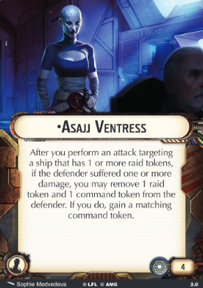 Asajj Ventress is a Separatist officer and I see one use for her: Count Dooku fleets. Fitting for Dooku’s apprentice.She’s used to disrupt enemy ships that have Raid tokens. Twice the disruption, double the… something. Remove the enemy’s Raid token, but steal a command token! Dooku’s whole thing is dishing out Raid tokens to the entire enemy fleet. They belong together.