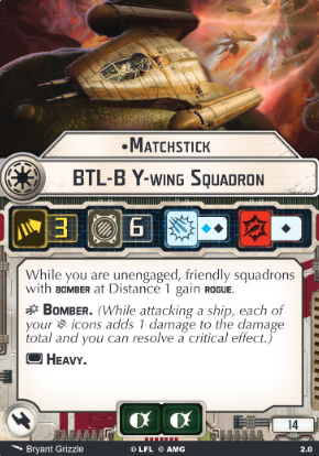 Matchstick is the Republic’s bomber group leader. He only costs 4 points more than the generic BTL-B Y-Wing for a double-Brace and great area buff ability.As long as he’s not engaged, nearby allied bombers radius gain Rogue. Rogue is a premium keyword, so dishing it out as an aura is awesome. He is also a friendly bomber to himself, so he gets the bonus too.