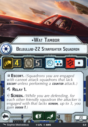 Wat Tambor is an ace without a special ability. He’s more of a super-squadron than a traditional ace. For 5 points over the terribly named Belbullab-22, he gets a Brace + Evade token suite, upgrades his anti-ship die to black, and gains Escort.Let’s get one thing out of the way: he’s a meat shield.