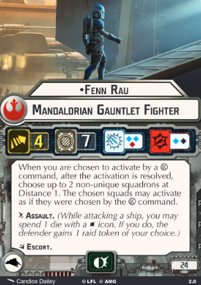 Fenn Rau is the Rebellion’s new team play ace. As long as you activate him via a Squadron Command, he commands another two nearby allied squadrons. 7 HP with Escort is sturdy, too. You can ignore that Assault keyword. That was always the worst part of Gauntlets.The arithmetic here is brutal. Hitting him with a squadron command adds another two squadron commands to the activation. That’s an entire flotilla’s value in squadron boosting. He can extend a ship’s command range with his range, or daisy-chain a VCX-100’s Relay ability to take it further. Rau joins Hera and Jan Ors in a long tradition of support excellence. You just have to be mindful of his terrible anti-squadron firepower (for the cost) and fairly high cost.