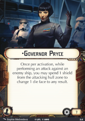 Governor Pryce gives the Empire an expensive and powerful dice control officer. 7 points puts her into the deep end of the officer price tag, and the Imperial officer slot is notoriously stuffed with excellent options. To compete, she gets an eye-popping ability.Pryce damages her ship’s shields in exchange for the superb ability to set a die to the result of your choice. Our thoughts naturally drift to the brutal hit + crit result on black dice, or the double hit on red dice. She can also dig up a vital accuracy result from red and blue dice. She works on Salvo attacks, too. You can’t add dice to Salvo attacks, but you can modify them otherwise. That use case doesn’t even count against her once-per-activation rule because it triggered during an enemy activation.