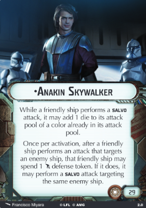 Anakin Skywalker’s can be interpreted in several ways. No matter how you interpret his rules, he’s busted. He is now the game’s premier Salvo commander (sorry Luminara), and one of the best offensive commanders.He definitely allows your ships to perform a Salvo attack after making a regular attack against enemy ships. The ‘once per activation’ wording also implies that he can be used during enemy activations, or else it would refer to ‘your activation’. His purpose is aggression at the risk of recklessness, which lines up perfectly with the character.