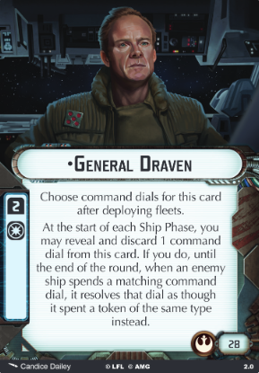 General Draven hails from Rogue One, which automatically makes me like him. His rules break away from Rebel convention by disrupting the enemy. That’s a very Separatist gameplay style. Rebels commanders usually make your fleet better at killing, surviving, or running away.His shtick is disruption. He denies an opponent their most powerful commands for two rounds of your choice. That’s ruinous for fleets who rely on executing specific commands at crucial points. Draven is almost a hard counter to squadron fleets. Their carrier was going to use a Squadron dial to command five squadrons? No. It now commands one squadron. Their Imperial-class Star Destroyer needed a Navigate dial to get its guns on target? No guns on target for you.