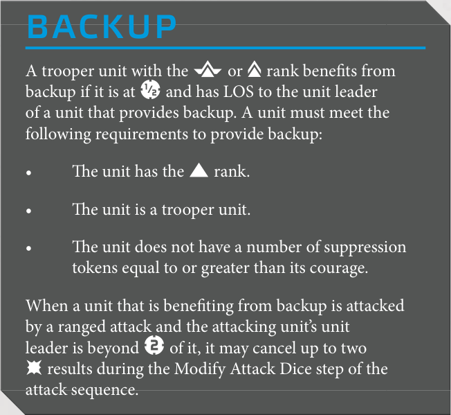 The existing cancel 1 or 2 Hits system of cover has been replaced with a rolled save system. A unit in cover can now roll a white defense die for each Hit in the attacker's pool. If the unit has light cover, each Block cancels a Hit. If the unit has heavy cover, a Block or Surge cancels a Hit.Rolling a cover save does not prevent the use of dodge tokens and defense dice, which are resolved afterward.