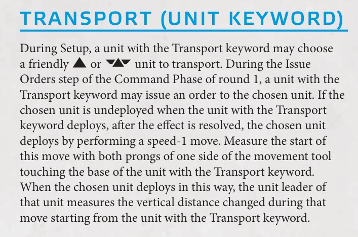 Credit: Atomic Mass GamesThe Transport keyword now uses many words to describe a forward-deployment ability for the units inside. Units that are transported can get ahead of the competition (by a fair distance, too). But they're asked politely to disembark in Round 1. There is no re-embarking or using the unit from inside a transport.