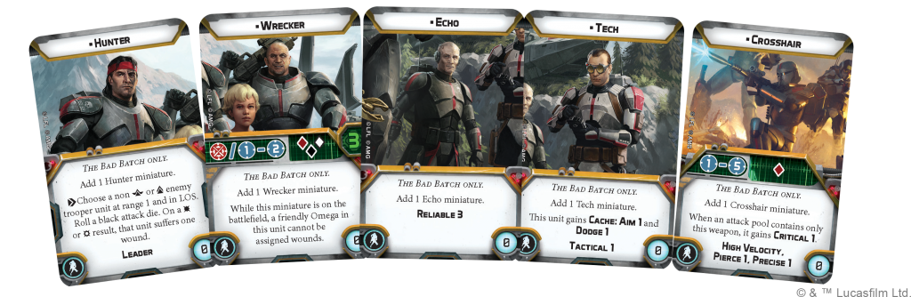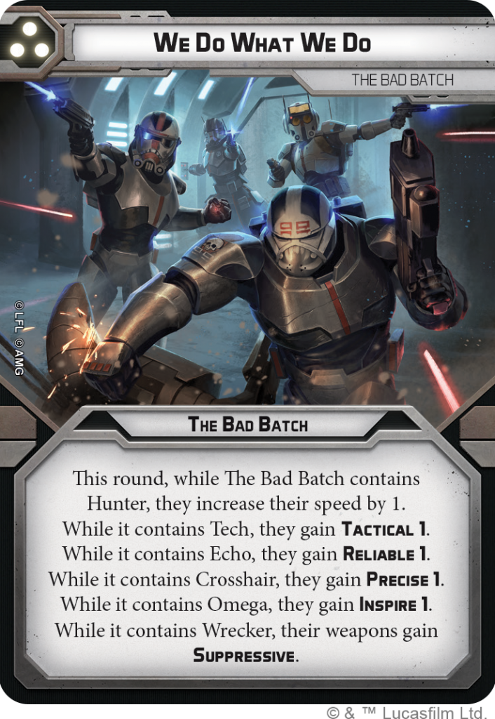 Copyright LFL, AMGThere is really only one unique card to talk about with this unit, because the squad members are the only upgrades you can equip. However, they do have a fantastic 3-Pip Command Card We Do What We Do. In my opinion, regardless of the version of the Bad Batch you are taking (GAR or Rebellion), this card is an automatic include. It’s that good. The round you play it, you gain even more keywords to benefit the squad. They gain an additional Tactical 1, Reliable 1, Precise 1 (with Crosshair), Inspire 1 (with Omega), their weapons gain Suppressive, and their speed is increased by 1. When you absolutely, positively need this unit to do something, you play this card.