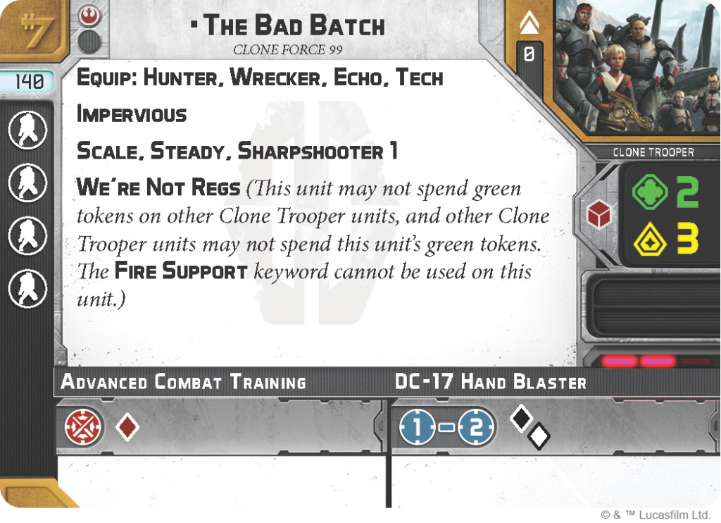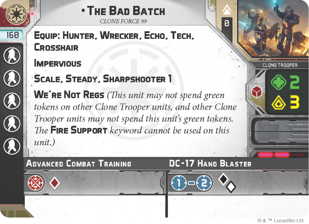Copyright LFL, AMGThis is a very elegant solution to questions I had about this unit in Legion. Each of these characters are very different individuals, but they also work really well as a unit. How would this be represented? Well, to begin with there are TWO versions of this unit: the 160-point GAR version and the 140-point Rebel version. You lose Crosshair for the Rebel version, but for 10 points, you can add Omega. For both versions, the only upgrades you have are the remaining members of the squad, and you have to equip them, with each one adding different bonuses to the overall performance of the squad. At a base level, they add 1 Red attack dice in Melee, and a Black and White attack dice from range 1-2. They also have 2 Wounds, 3 Courage, and roll Red Defense dice. They also have the keywords Impervious, Scale, Steady, Sharpshooter 1 and can’t use other Clone Units green tokens, and other Clone Units can’t use their green tokens. They also can’t use the Fire Support keyword. Each individual adds the following: