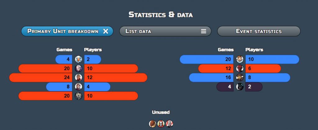 It's more or less what I've been playing in solo games so Will had seen most of it before and I knew my way around it. At the end of the day it's Clones and they're one of the more user friendly forces in my opinion. As for the rest of the field, Longshanks is a brilliant piece of event software (website) and can show us what everyone else took at the touch of a button - just bear in mind that as there are 2 players on each team you'll need to half the "Players" number. For example there was 1 team with Ahsoka who played every game, showing as 2 players due to the team nature. As you can see the Darkside has slightly more of a hold over the event but Obi-Wan (5) and Luminara (4) were top of the pile when it came to the number of players controlling them on the Lightside.