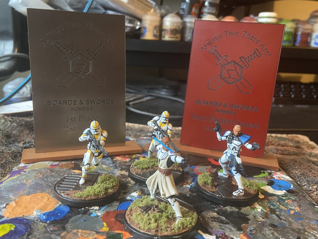 The Final game was against the team who had travelled the furthest for the even in the "Hector Appreciation Society" who was formed by Dan and Dominic. They were in control of the other Mandalorian Team, this time led by Obi-wan and Ahsoka, Jedi No More. We once again took the centre objectives but lost the Commando's early to Obi-wan meaning they were contesting for what seemed like an age. But being able to move characters around via expertise rolls or Ahsoka's/Rex's tactics meant we were able to keep trading 3 points each on the Struggle. As this steadily filled up the tracker with momentum, it became clear we would win by default so they moved to position for the future.They finally relented and we were able to pick up the struggle before the once again we fought a pretty weak and very quick second struggle to make it 1-1. Once again the minor placements were we able to achieve in the second struggle meant that we drew a favourable map and were able to select the better map for ourselves. In a very similar manor to the previous game we were able to make a very quick struggle three, winning in only 2 activations.