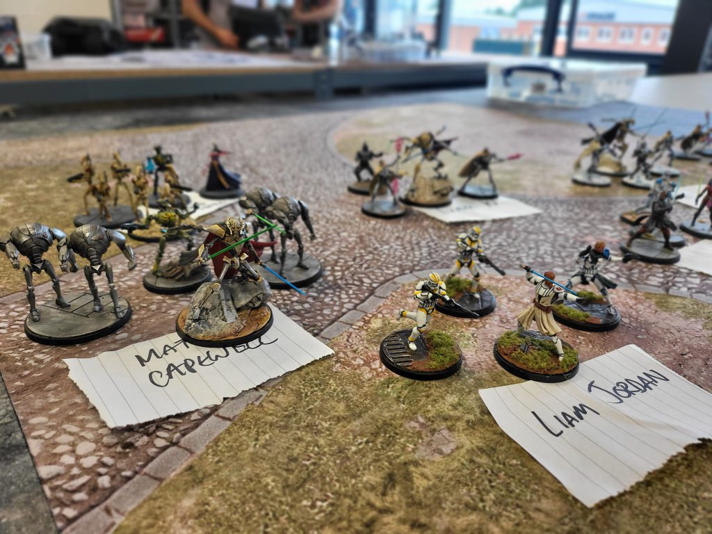 In the first round we were drawn against "Tactical Stupidity" (their team name, honest) in the form of Greg and Niall. They were introduced to us as one being Tactical and the other bringing the stupidity which was a little harsh as this was a really close game. They also had Obi-Wan and Luminara with the only difference being that they had Bariss instead of Rex in their roster.It was a little back and forth on the table with us taking struggle 1 before getting hit back in around 2-3 activations and losing out in struggle 2. We were running a little low on time and rather than using Mission Critical the event just went for a "whoever was winning at that point in time" as long as you'd had equal activations. We were up in the 3rd struggle when the 2 minute warning was shouted out, we quickly played out another activation each with Greg and Niall managing to move the struggle tracker over to their side before we pulled it back over in the last activation to win the round.