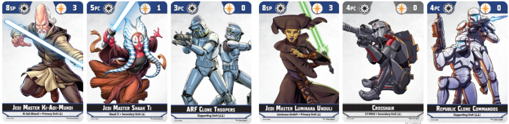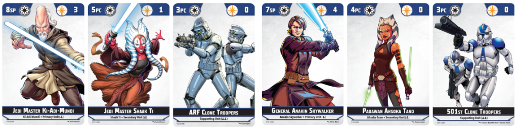 This list has some key models that you must take every time. Yes, you can swap the supports out for Padawan Learners or maybe even remove Ashoka for Rex, but Shaak Ti and Anakin are an absolute must. I personally like to put ARF with Anakin but it’s dealers choice on how you want to play.