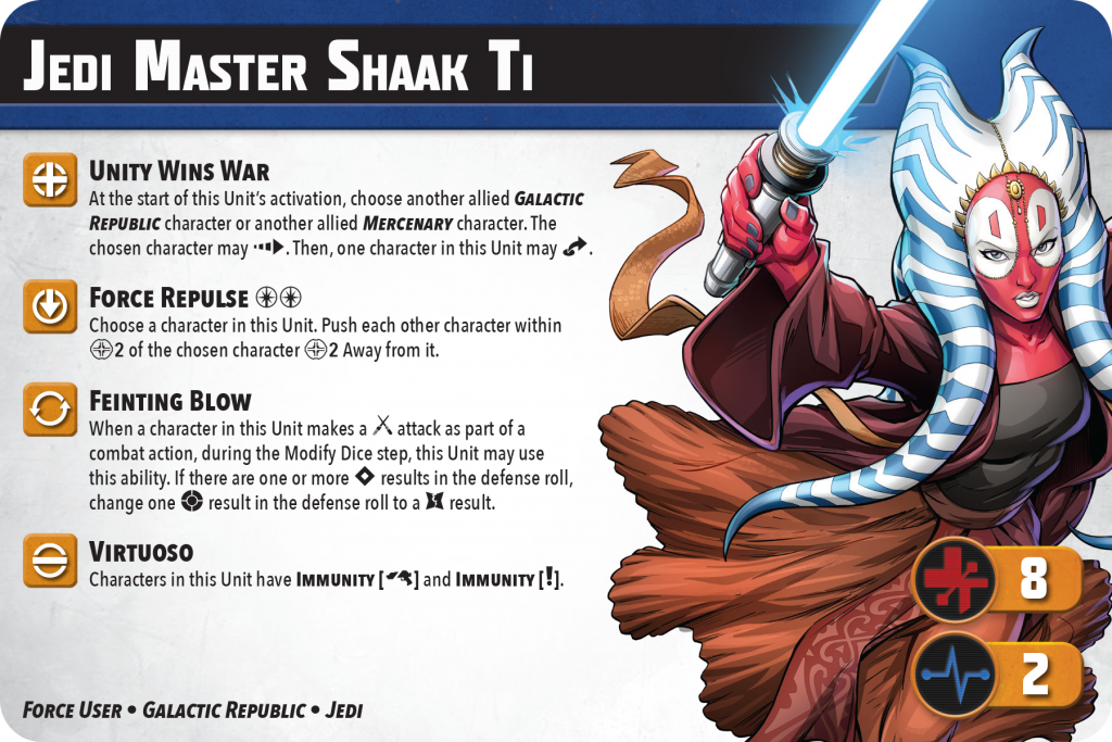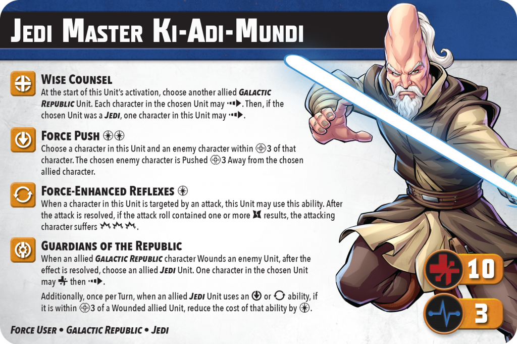 On paper, this card really doesn’t seem that great. She has low health and average expertise. She can’t even hit that hard because she moves strikes to crits meaning you rarely get strikes through and are relying on 2 to 3 crits on your attacks. That being said, she is an auto-include in this list as the extra starting force, in conjunction with Ki-Adi’s force discount, allows you to play reckless. Her diceless displacement is also top notch and usually means you will take any point she sets her mind to. You will almost never have a bad turn with this model unless she is just drastically out of position. I once tactic jumped her, full advanced, then hunkered onto point just so I could force repulse. Yeah I didn’t get to attack but her goal is to take points, not get wounds. If you want to talk about models that get wounds…