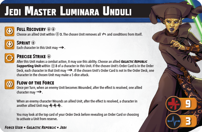 Personally, I love Luminara as a model. Yes, she is not as impactful as Ani but she does have some tricks. When pairing her with Ki-Adi, you do so with a different tactic in mind. You still want those wounds because every wound now means two dashes but you have to have a model that can reliably get those. The heals also forces your opponent into focus firing down your units or lose to attrition as Lumi heals them back up.