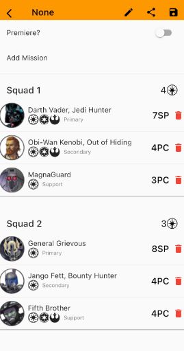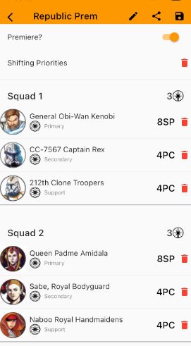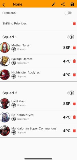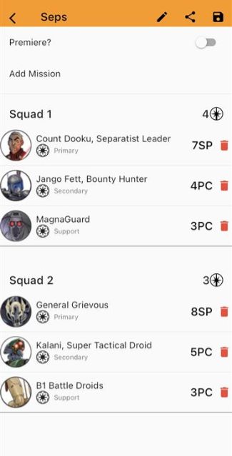 Below is a pretty standard full Sep list. But it can certainly be turned up a little more in terms of bang for your buck if you're willing to set outside of the full synergy offered by building in a certain way. This is very similar to a lot of the Republic Lists. You also have choices to make in terms of how you want the list to function. For example Jango is (and I'm sure I'll mentioned it plenty of times) one of, if not the best secondary character in the game for what he offers. But at the same time if you're running double Droid Support, then would Kraken in the below list be a better option? Sure you lose out on Jango but you're pushing the Droids to do more via Krakens effects on them. It's something you have to weigh up when deciding on lists and there isn't a correct way to do it, it's about finding what fits your style.