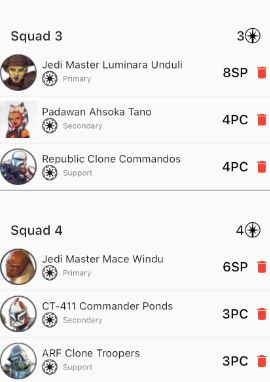 Here you've really got a few choices to make, you can clearly got all in on something like the Galactic Republic. They have at least 4 more than capable Primaries and and enough Clones without asking you to do anything else to fill the squads. You could go the total mix approach, take 2-3 squads which work well together and then add in something like the Cad Bane Box (or trade in Jango for Sing) and just have that as a decent option. Next you can go for a split, take 2 squads of Galactic Republic and 2 Squads of Separatists for example meaning you only ever really play with 1 set of the other set, that'll really keep your opponent guessing. Finally you just go for the 4 best squads approach, play the worst of those early on and be left with 2 or 3 squads of absolute powerhouses, but limited synergy.