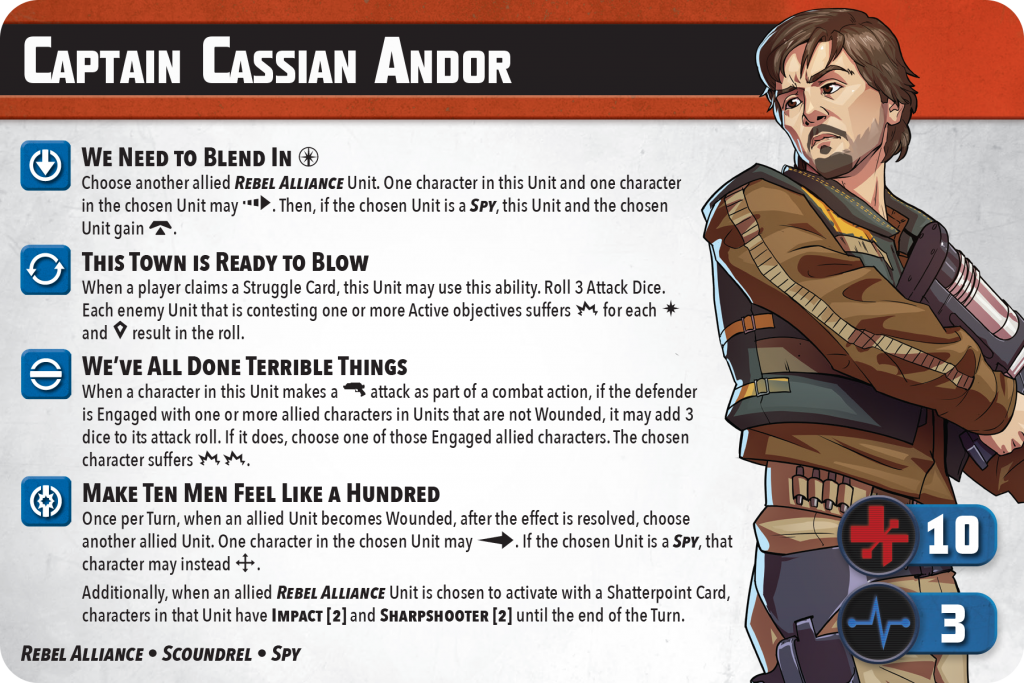Jyn brings a fairly standard stat line. She has the “normal” eight Squad Points and three Force points that most primaries bring. Her stamina of nine is a little on the low side but as we will see later she can be extremely tough to kill. Her durability is the normal three that you expect on a Primary. As mentioned above she has three keywords: Rebel Alliance, Scoundrel and Spy.The first keyword is her base “faction” tag, Rebel Alliance. Despite being an extremely mobile character, Jyn often needs a little shove to get started, fortunately there are many abilities that move Rebel units both on primaries but also on secondaries like Sabine’s My friends make the Impossible Possible or Bodhi Rook’s Rogue One, Pulling Away. Jyn’s best abilities also look for the Rebel Alliance keyword.