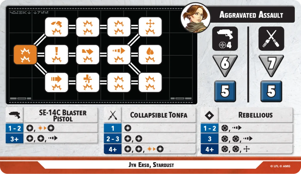 As with all current primaries, Jyn has 2 stance cards. One side is slightly better at melee attacks and the other is slightly better at range, however they are both good at both. In fact when making a reduced dice attack such as her tactical five die attack, her ranged side becomes better and melee and vice versa. The biggest “weakness” of her stance cards is that on both sides her pistol is only range 4. They also share the same defensive dice and expertise. She has no crit mitigation but five defense dice in both melee and ranged combined with an expertise chart that has a dash on one makes Jyn risky to attack. Unless you are expecting to kill her immediately this can make Jyn risky to attack.Both sides also share the same offensive expertise although they swap between melee and ranged depending on how many dice she rolls. Both focus on crits, in fact, at no level does her expertise ever provide a hit. When rolling seven base dice for an attack, your first two expertise become crits and you have the potential for a third crit if you get four expertise. When rolling six base dice her expertise is even more front heavy with one expertise becoming a crit and hit to crit. At three expertise you gain a dash and the second crit is guaranteed.