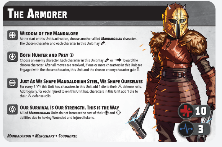 Why use a lightsaber when a Hammer or Tong will do the trick? This model is not perfect but is a cornerstone for the Mandalorian build. Her innate ability, Our Survival Is Our Strength. This Is the Way, prevents wounding from increasing the cost of your active and reactive abilities. As stated earlier, this means Stronger Together will always be free as long as she is on the board. But she adds even more synergy with her tactic, Wisdom of the Mandalore, that allows another Mandalorian and herself a jump. The Armorer can reach nearly the entire board with her free jump and active advance. I've started plenty of games off jumping Paz up (one of your slower models) and double advancing to hit whatever my opponent had moved up first.