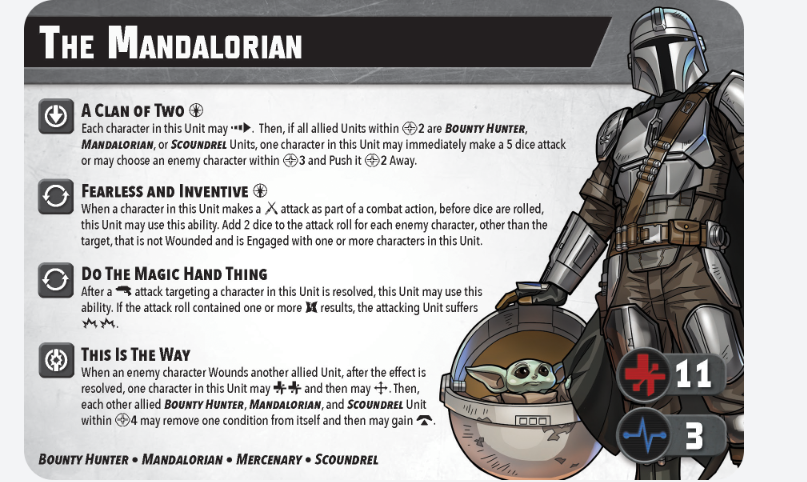But let's say your opponent does get that elusive wound. Was that actually a good thing or did they just progress your board state? Everyone should be well aware of the tankiest primary in the game (take a seat Dooku) and his innate ability to reposition when an ally is wounded, but how many people know about the second part, handing out hunkers and removing conditions to models within 4? One of the faction's weakness is that Mandalorians don't roll many defense dice making Expose particularly powerful against them. Hunkers are a good way to help combat that weakness and the condition removal is always nice to keep them moving back on points.