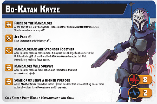 The faction has an honorary third primary with Bo-Katan, leader of the Clan Kryze. Her tactic to jump any other Mandalorian and passive steadfast and protection bubble make Bo one of the best support pieces in the game, not to mention how incredibly fast she is! This model is a fantastic pull turn 1 as she helps develop your team while also potentially reaching your opponent's deployment if needed. Her attacks are weak, though you don't need much to get a lucky shove and have an annoying defensive piece contesting home objectives.