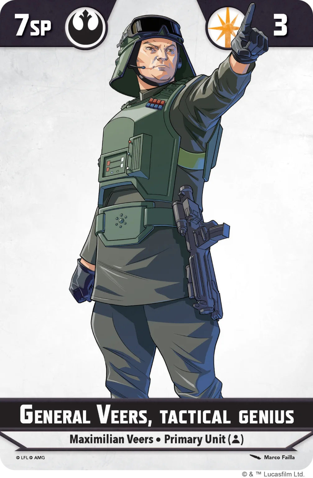 General Veers opens the door to a new Empire Strike Team focused on Stormtroopers. He's likely to land on the trickier end to get results out of, as he demands a lot out of his positioning and his troops around him, but only stands to become more interesting to play as the releases flow. His supporting cast in the pack is a mixed bag, but the Snowtroopers should make a welcome cheap addition to a number of Empire strike teams. Thematically, AMG did a great job and General Veers truly represents the implacable nature of the Empire's invasion force.Thanks for reading and may the order deck smile on you!