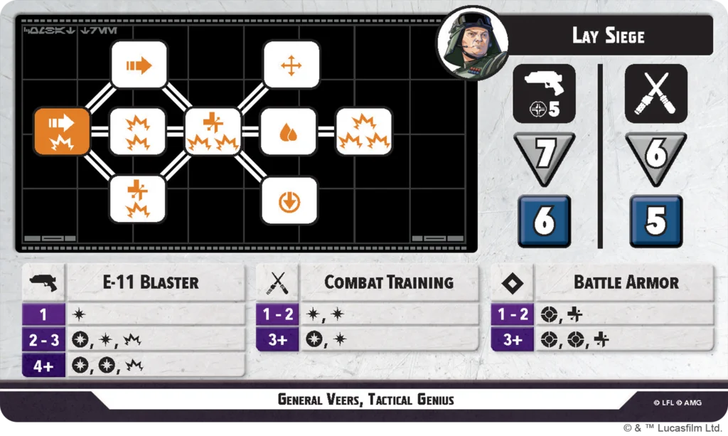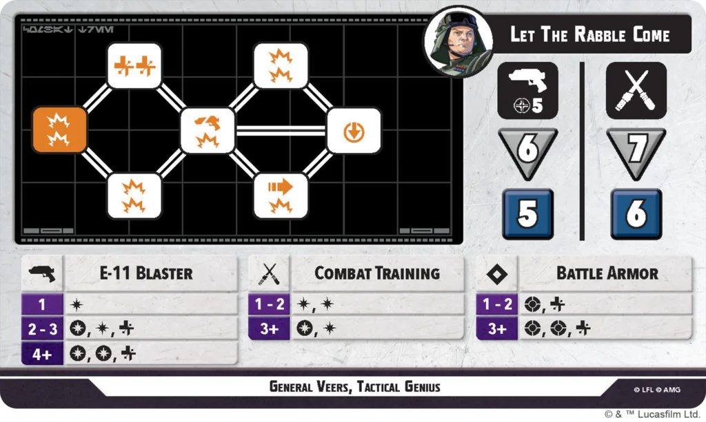 Defensively, Veers has stormtrooper armor with a bonus recovery, so he will not be terribly durable - understandable for a backline commander. The only difference is an extra die on ranged or melee.