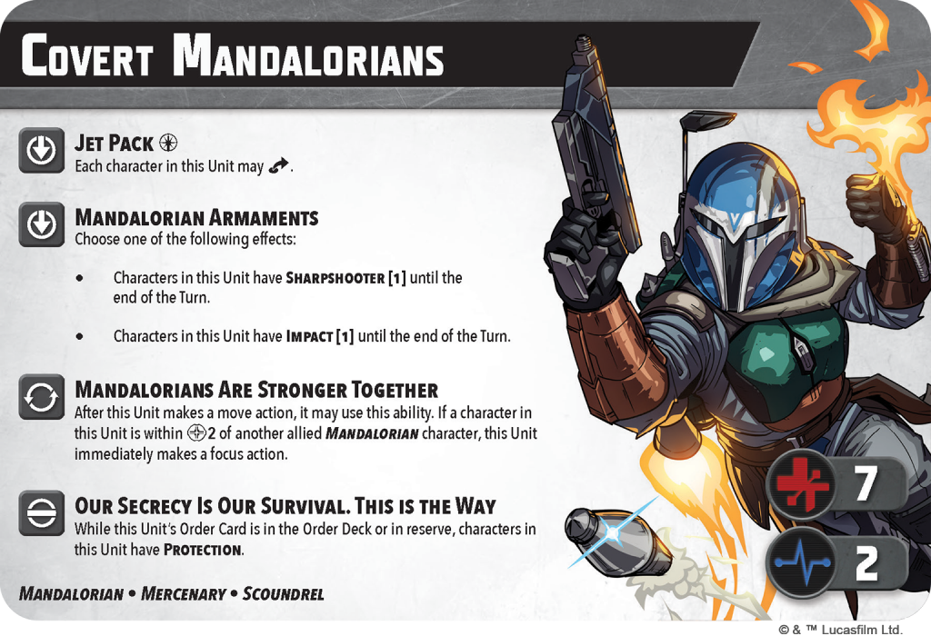 Copyright AMG & LFLFinally, we have the Support Unit of this box with the Covert Mandalorians. To illustrate having the option of either using their rockets or blasters in combat, their ability Mandalorian Armaments allows them to choose between Sharpshooter and Impact for that turn. Additionally, they can use their Jump Packs to reach objectives or enemy characters at a higher elevation. Mandalorians Are Stronger Together allows them to immediately make a focus action if they end a movement within Range 2 of another Mandalorian unit, and Our Secrecy Is Our Survival. This Is The Way grants them Protection if their card is in Reserve or still in the Order Deck. Their only stance, Adherents of the Way, allows you to really customize how you want to impact your opponent’s units. There are two starting points, but then you can go in any direction for the desired effect after that.
