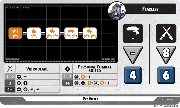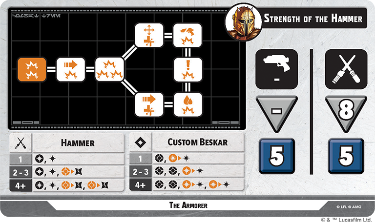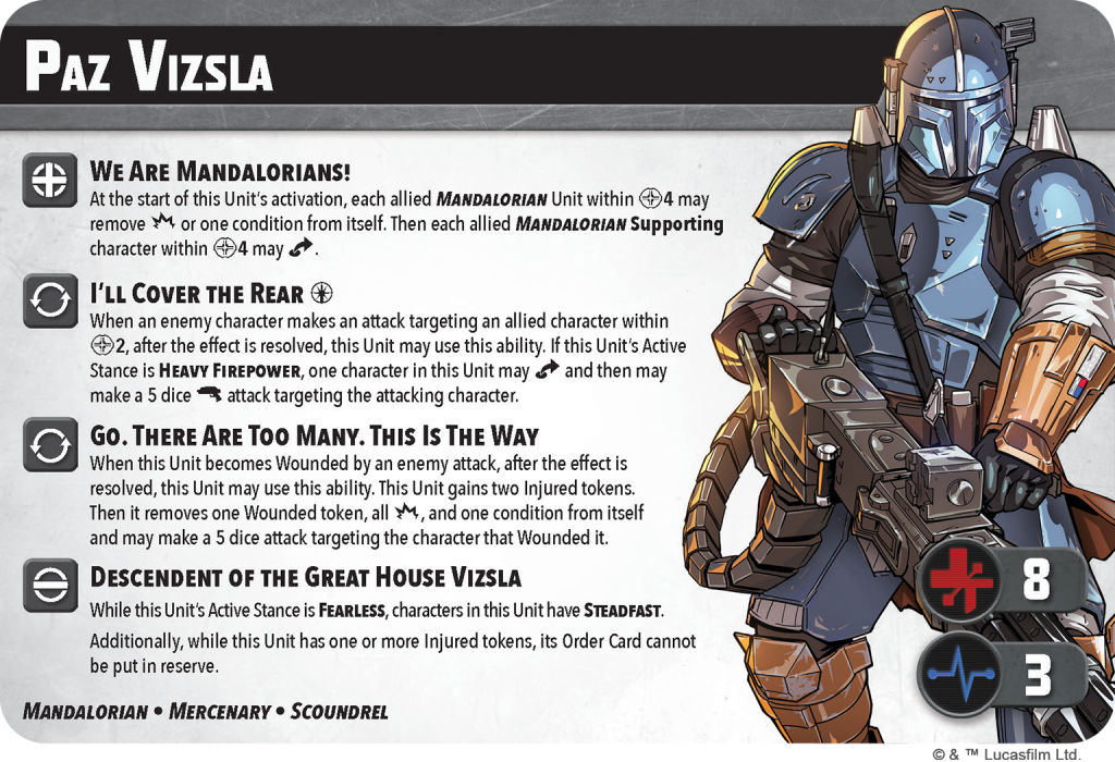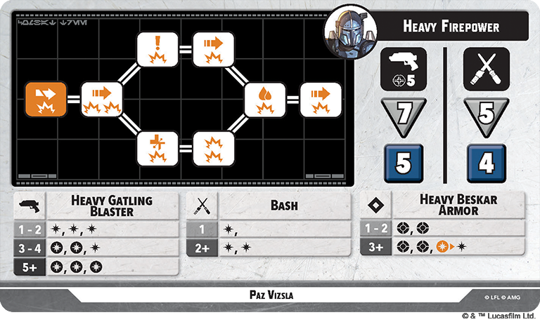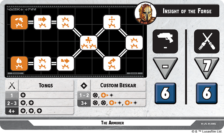 Copyright AMG & LFLThe Secondary Unit in this box comes in at a healthy cost of 5 PC, which partially explains why The Armorer has 9 SP, and also severely limits who he can pair with just from a cost perspective. We Are Mandalorians! is a great Tactics Ability as it allows every Mandalorian unit within Range 4 to remove one damage or condition from itself. If they are a Supporting Unit, they can also jump. His Identity grants him Steadfast if his active stance is Fearless and he can’t go into Reserves if he is Injured. He has two reactive abilities in I’ll Cover The Rear and Go. There Are Too Many. This is the Way. They both allow Paz to attack an enemy unit out of activation, which is always great, especially since the force cost doesn’t increase if he is Wounded or Injured. Go allows him to shake off damage and and a Wounded token in exchange for two injured tokens before making a 5 dice ranged attack. Cover allows him to roll a 5 dice ranged attack after an ally within Range 2 is attacked if Paz’s active stance is Heavy Firepower. His Heavy Firepower stance is more ranged-focused, and Fearless is more geared toward melee. Heavy allows Paz to hand out 7/8 damage depending on the path you choose, as well as Pin, Shoves, Strains, and Recover. Fearless only has one path, and is melee-only. Paz can use his Vibroblade to deal 9 damage as well as Strain, Shove, and two Recovers if he works through all 5 points of his tree.