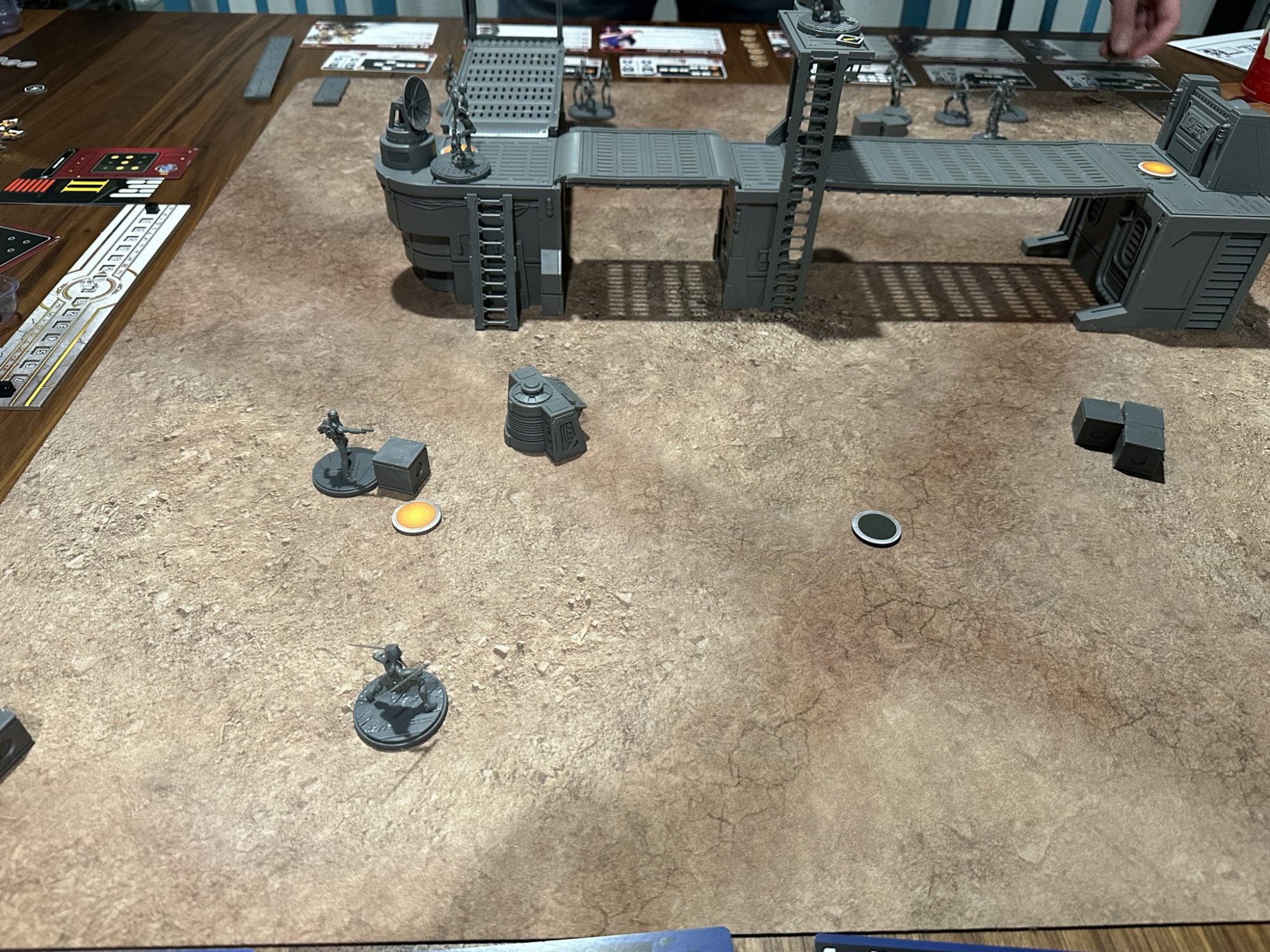 Shatterpoint's technical definitions of Line of Sight are much cleaner once you internalize them, but they create very unintuitive situations for both LOS and cover. Any terrain at a lower elevation than a target is ignored for determining LOS so effectively any model standing on terrain can both see and be seen by any model on the ground, regardless of what intervenes. Because the Core Set includes no Elevation 2 blocking terrain, there is effectively no way to block LOS to or from models standing on any form of terrain.