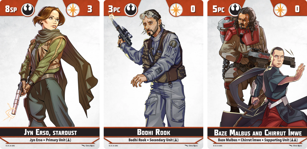 Images © Lucasfilm © Atomic Mass GamesAs the leader who inspires the Rogue One team to go against orders, Jyn Erso is the only logical choice to be this squad’s Primary unit. She is joined by Bodhi Rook, an interesting choice of Secondary unit given his relatively passive role in the film, and the inseparable team of Baze Malbus and Chirrut Îmwe, two characters who could never be anything other than a single Supporting unit.