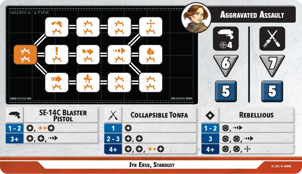 Her melee stance, Aggravated Assault, has an interesting combat tree that splits roughly into two branches focused on heavy damage, one with a disarmed condition and a reposition, and the other with a shove and a heal. The middle branch deals less damage but drops more conditions on the target, along with potentially giving Jyn a dash move. Combined with Reckless, Agressive... and I Rebel, this could have Jyn making a 9 (or more) dice melee attack, and then using two dashes to get well out of range, possibly even out of line of sight of the target.