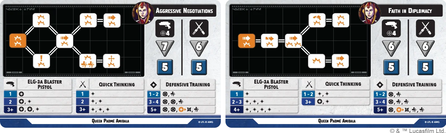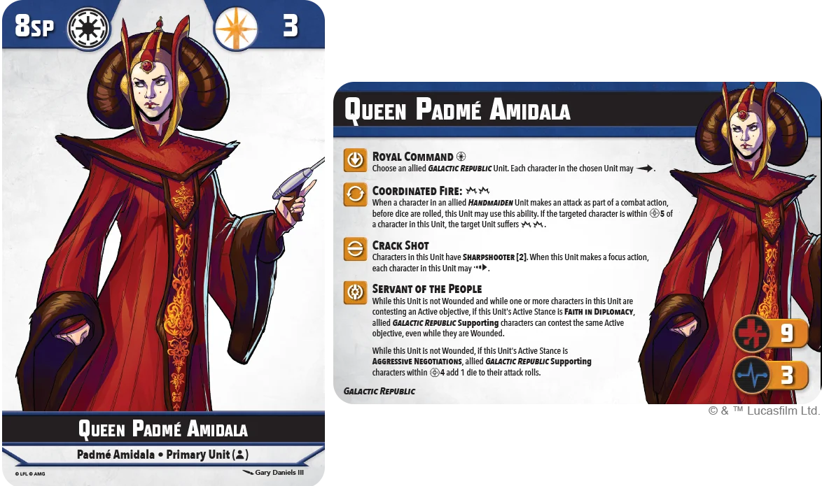 The first Identity ability to be released that depends upon which stance the Primary is in. While in her Aggressive Negotiations stance, she provides an extra attack die to your Galactic Republic supports. Alternatively, in Faith in Diplomacy she allows your Supports to contest even when they are Wounded. This can enable dramatic objective swings when the opponent does not suspect it. Neither of these effects apply if Queen Amidala is Wounded however, so it is important to keep her in a position of safety.Fortunately, both her supplementary units have tools to try and make sure this is the case!