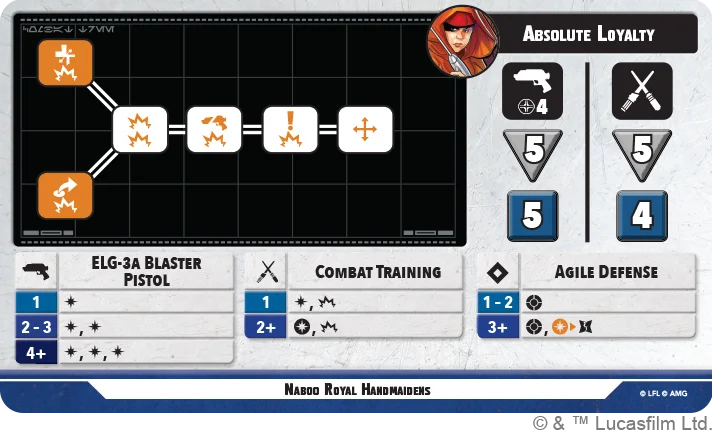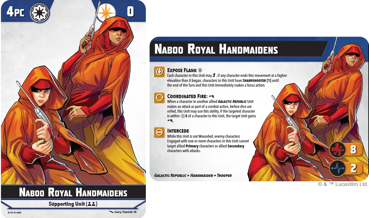 The other half of the Magnaguard toolkit shows up here, and is a great representation of their role in the canon. This is of less value here however with less health and worse defensive capabilities making it a lot easier to Wound and shut off this ability.Naboo Royal Handmaidens Stance