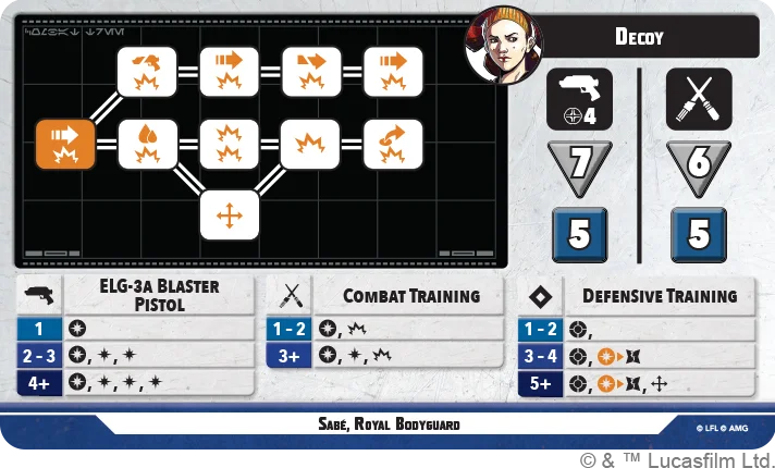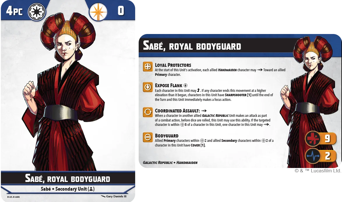 You know and love it from the Magnaguard, more defensive dice against ranged attacks is always good. Unique to Sabé is the fact that she is always a Secondary unit within R2 of herself, so gets to benefit from Cover at all times!Sabé, Royal Bodyguard Stance