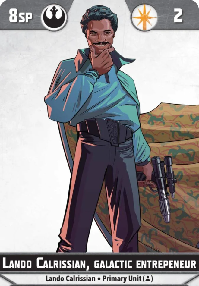 Finally, we have Lando’s unique identity called Conflicting Responsibilities. This ability alone is why the entire box is worth it because with every release, it will only get better. At the end of setup, you get to choose one of two tags to apply to Lando, Rebel Alliance or Galactic Empire. Additionally, whenever you reveal an order card, you may choose an allied Scoundrel Unit to gain one of the tags Lando has. This means that ANY Scoundrel in the game has the option to become Empire or Rebel alliance when fighting alongside Lando, giving you some deep options for list building. I’m going to eagerly look at any new scoundrel, empire, and rebel release now and consider how they fit in a What Have We Here shell.