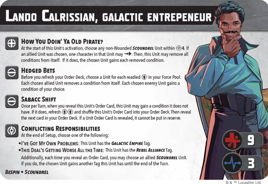 Going through his stats, Lando brings 8 points with 2 force and we see 9 health for 3 stamina which is an expected health pool for most gun slinging primaries. Lando isn’t as tough as a Jedi but he has his own mind tricks to offer. For example, How You Doin’ Ya Old Pirate? is a fascinating tactic that removes conditions from Lando and applies them to a Scoundrel within 4. The fun part is that if he targets an ally, he can dash the target after. Right away we get to see that versatility in play as you can either use this tactic to condition stack an enemy or use it on an ally to push them up the battlefield. The conditions go on after the dash is made so it’s reasonable to dash up a support and then apply the pin thus avoiding the pin’s negative effect. Or perhaps you have an expose and are within 4 of an enemy scoundrel? Well you can throw the expose on your target then shoot them for good measure! Moving on, we see Hedged Bets which is a fun ability that allows condition removal or placement depending on how much force you have left when you refresh your order deck. Lando doesn’t use force and thanks to his next ability, Sabacc Shift, it’s fairly likely you end up with a little force remaining at the end of your deck. Sabacc Shift lets Lando shuffle himself back into the deck to refresh two force and apply a condition of your choice to him. You must go with the next order card you reveal which could, in theory, be Lando Calrissian again. This means that if you pull Lando last in your deck, you should almost always use this ability to at least generate 2 force and gain a benefit from Hedged Bets but don’t forget that you are putting conditions on yourself when doing it!