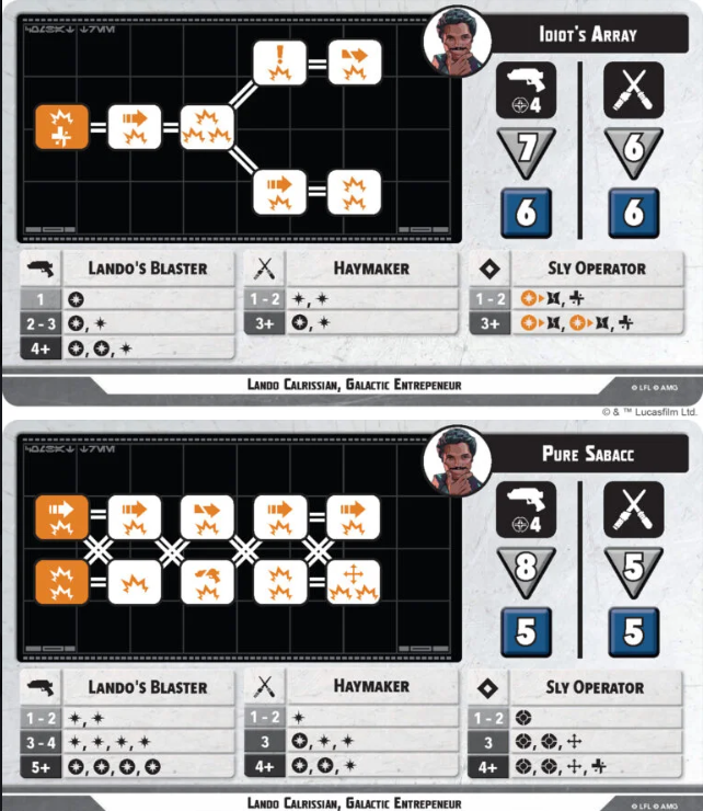 When it comes to combat, there is an obvious benefit to shooting with Lando. Taking a quick look at his Idiot’s Array side, we notice decent dice and expertise for ranged and poor dice for melee but it’s at least an option. His defense is honestly fine even though he doesn’t get many blocks from expertise. The ability to shut off 2 crits on 3 while rolling 6 dice is reasonable. The tree itself can spike early in damage giving you 5 damage on 3 successes with a shove/heal. I tend to focus on the early parts of the tree just because it’s what's most likely to consistently happen. Overall, this side is good enough to get work done but… it’s no Pure Sabacc. With his other stance, Lando takes a sizable hit to defense rolling 5 dice with poor expertise but he gains one of the best ranged profiles in the game. 1-2 expertise for 2 hits and 3-4 for 4 hits is outstanding, especially considering he rolls 8 dice. This tree is also shove city! If Lando wants you off a point, you best believe you are getting off that point. He can technically shove 4 times on 5 successes which is a feat not many characters are capable of. The tree does get weird with the criss-crossing but all you really need to know is that the max damage you can do is 8 on this side.