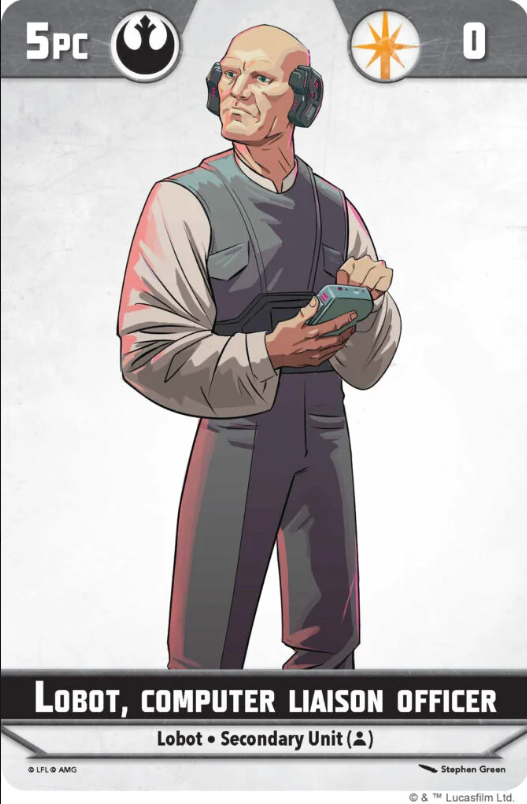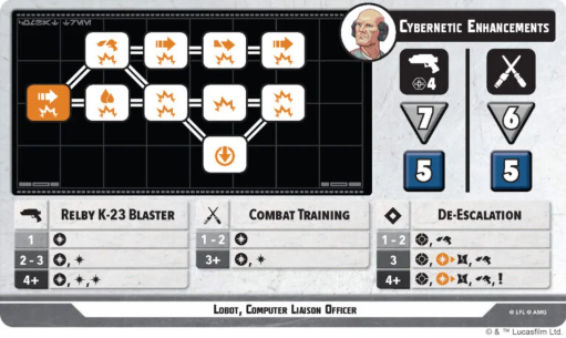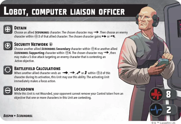 This secondary only has 8 health which is already a bit scary for 5 pts however, Lobot has a plethora of support options to warrant his low health pool. Detain is a powerful tactic that allows any allied scoundrel character to take a dash. Global tactics should always be valued highly and the option to pin/disarm an enemy within 3 is just a bonus. Keep in mind that Lobot is an allied scoundrel and therefore, can pick himself for this dash. His second ability is Security Network for a force. He unfortunately can’t choose himself on this one but he can choose another allied scoundrel secondary or supporting character within 4 to dash and attack a contesting enemy. Tactical Networks are pretty common at this point, especially from Droids, but what really makes this ability shine is that you can target a secondary with it. The options lead to some pretty powerful repositions and attacks with the best option likely being just Wrecker. His expertise is outstanding for low die rolls! But outside of that, you have so many different bounty hunters with the scoundrel tag and unique trees such as Jango that this ability has major upsides.