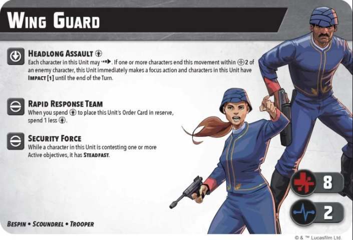 Overall, the Wing Guard are extremely cost efficient, have a great tag in Scoundrel, and can throw a good amount of melee dice to hope for those shoves. They fall behind defensively and don’t have the best tree to displace your opponent but they are only 3 pts after all.